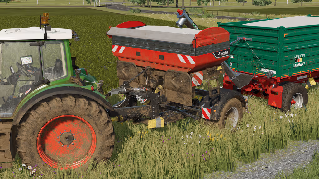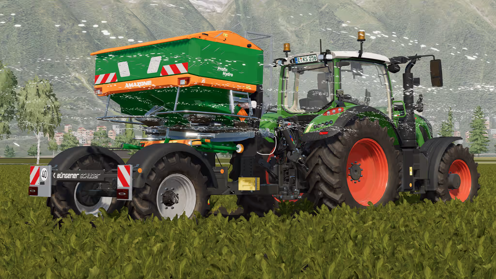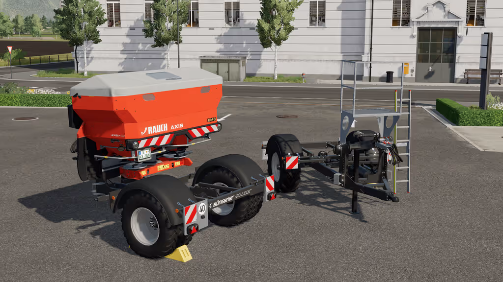 Räder für den StreuerDas Fahrgestell von Büngener und Schuder ermöglicht die Nutzung schwerer Anbaustreuer an kleineren Traktoren.